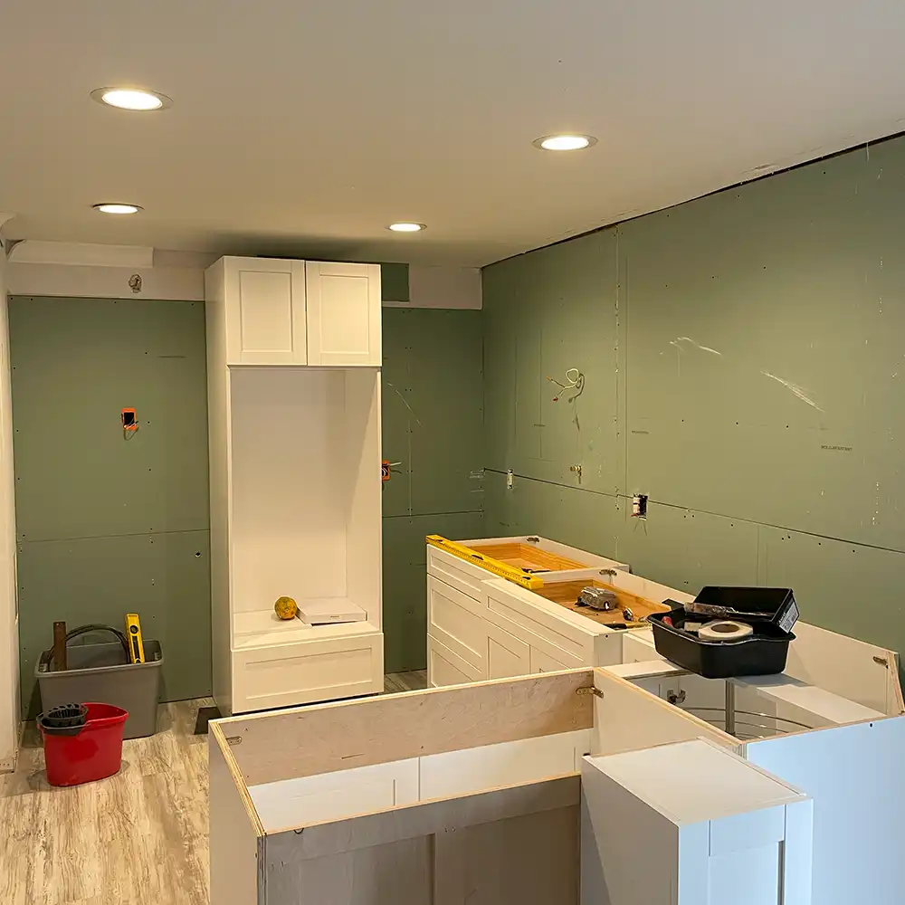The existing drywall in this kitchen was susceptible to water damage, mold, and wear over time. To combat these issues, we replaced it with high-quality water-resistant drywall.